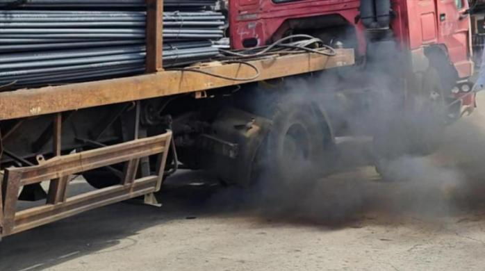 2024年5月19日,督察组现场督察发现,上海市宝山区佰隆码头使用报废柴油货车进行内部运输,排气口黑烟滚滚。图源:生态环境部