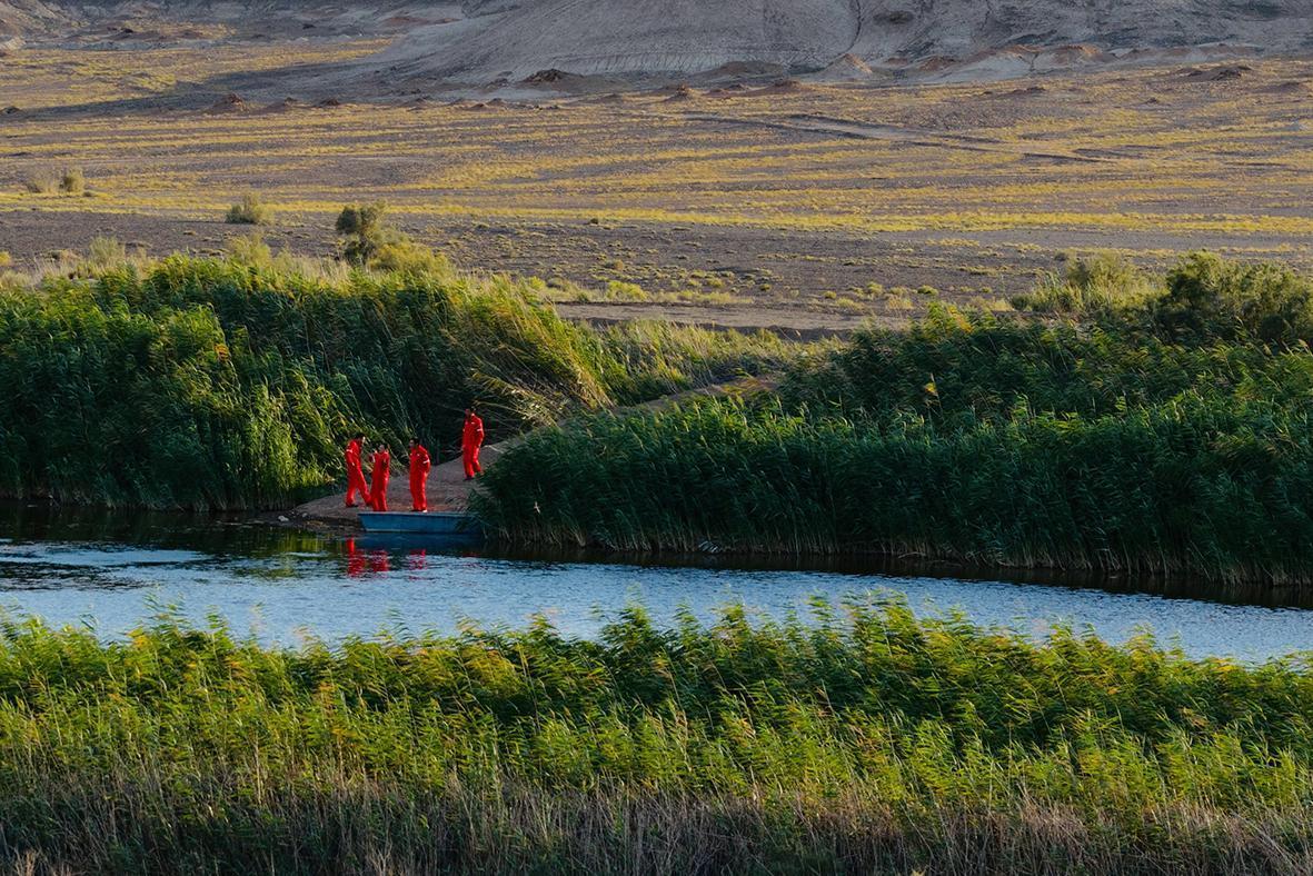 图为火烧山作业区环保志愿者在巡检火烧山湿地。