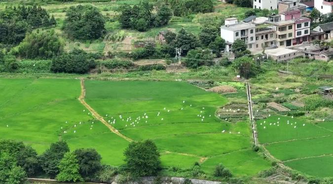 走进保干村,只见一群群白鹭如雪花般点缀在绿水青山间,翩跹起舞、灵动生姿。通过无人机镜头,只见这群白色的精灵舒展双翼,振翅掠过村庄、河流与公路,在远山青黛和乡村景致的映衬中,悠然栖息、嬉戏觅食,绘就一幅田园与生态交融的美丽图景。